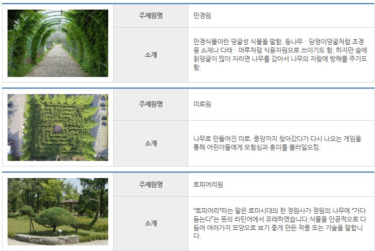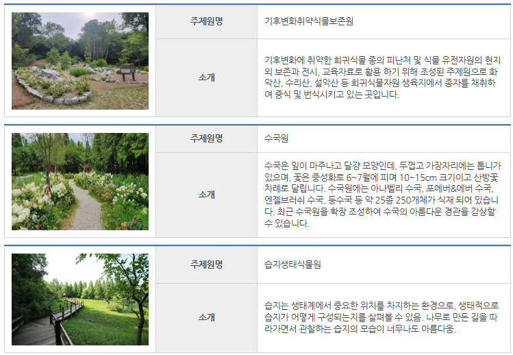 호습성식물원과 한국의 소나무원, 단풍나무원, 유실수원, 중부지역자생원 등이 있습니다.